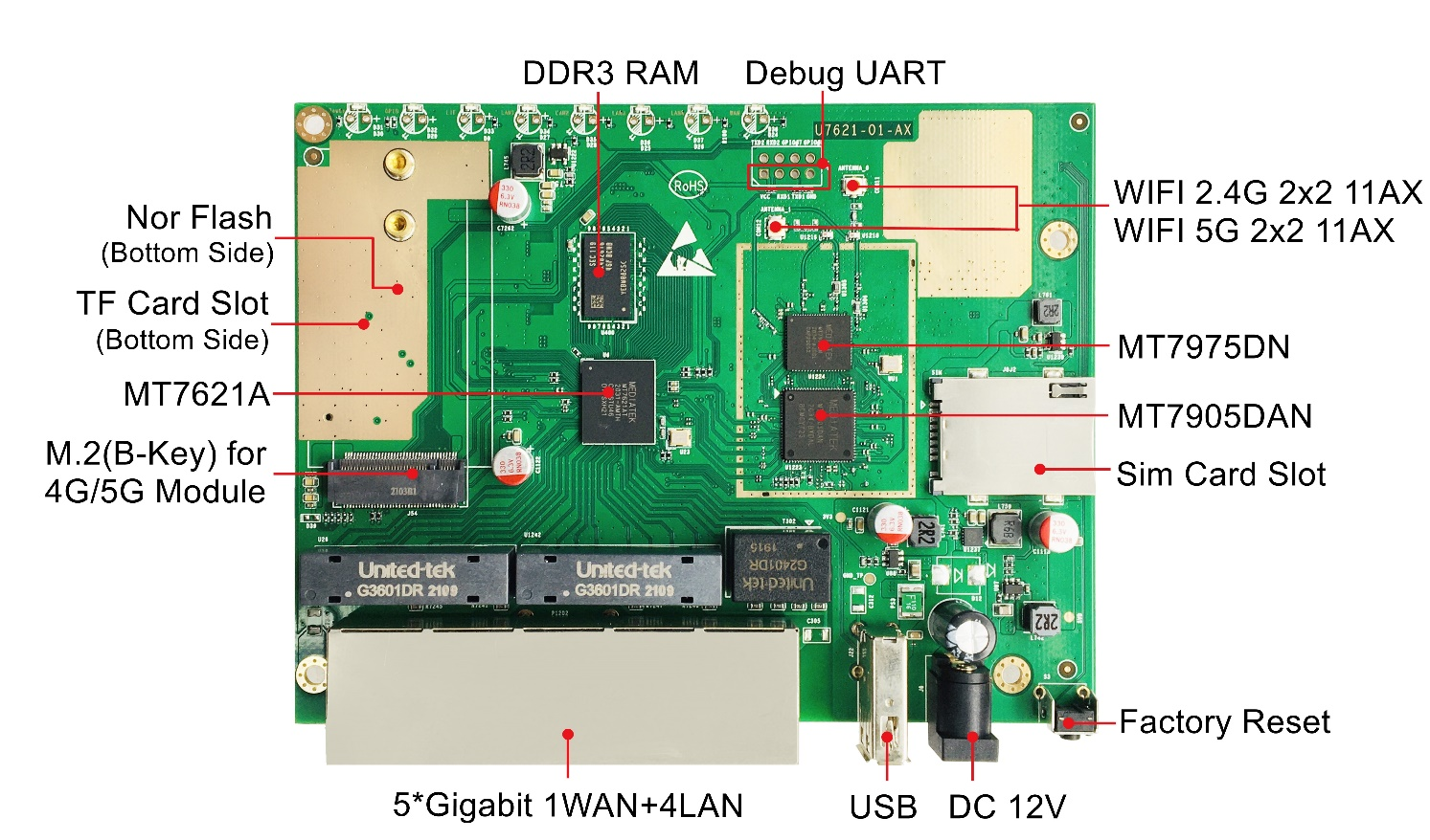 CPU: MTK MT7621A dual-core MIPS1004K (880MHz) WIFI6: MTK7975DN+MTK7905DAN |